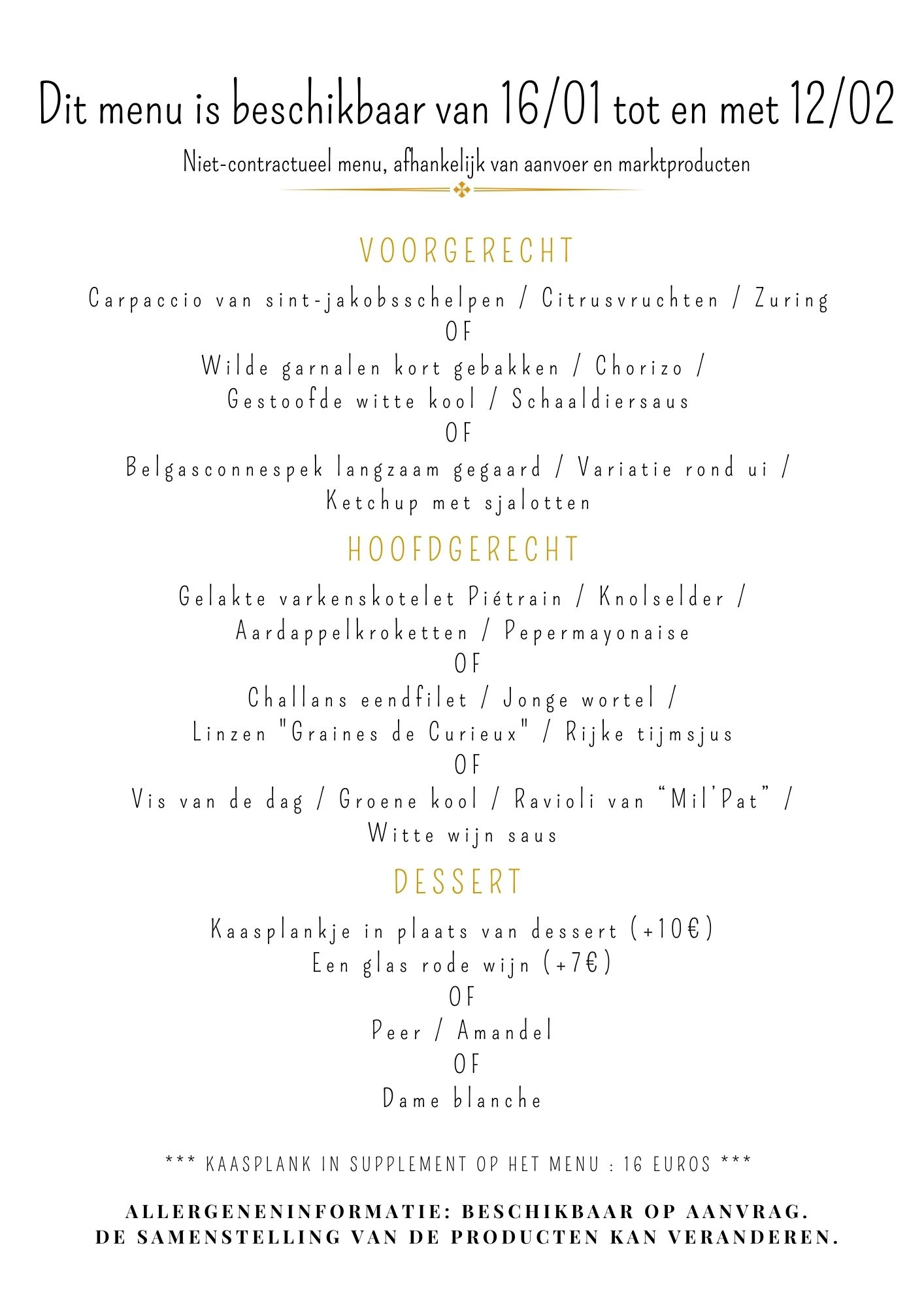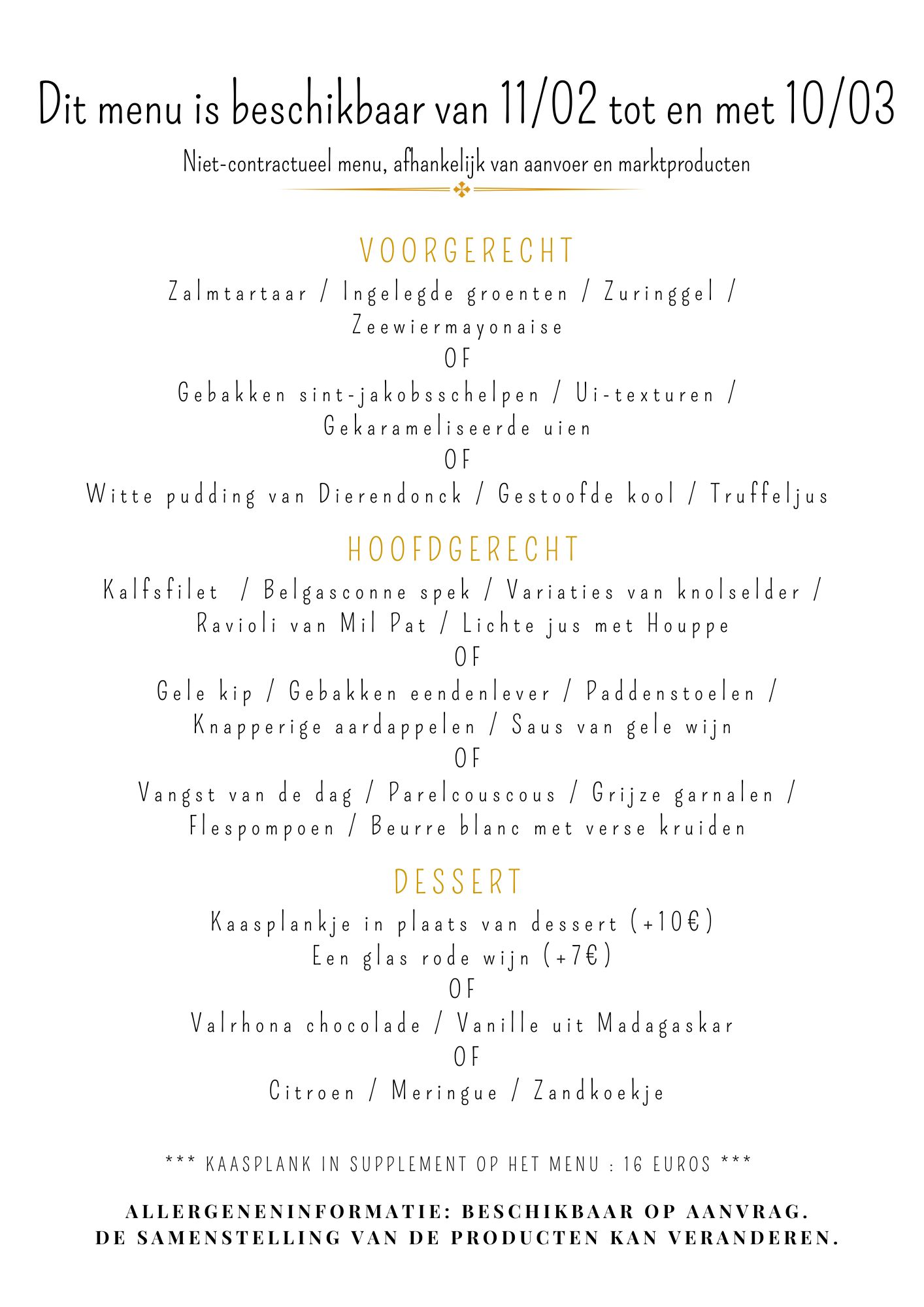 - 2-gangenmenu (hoofdgerecht – dessert) voor € 38